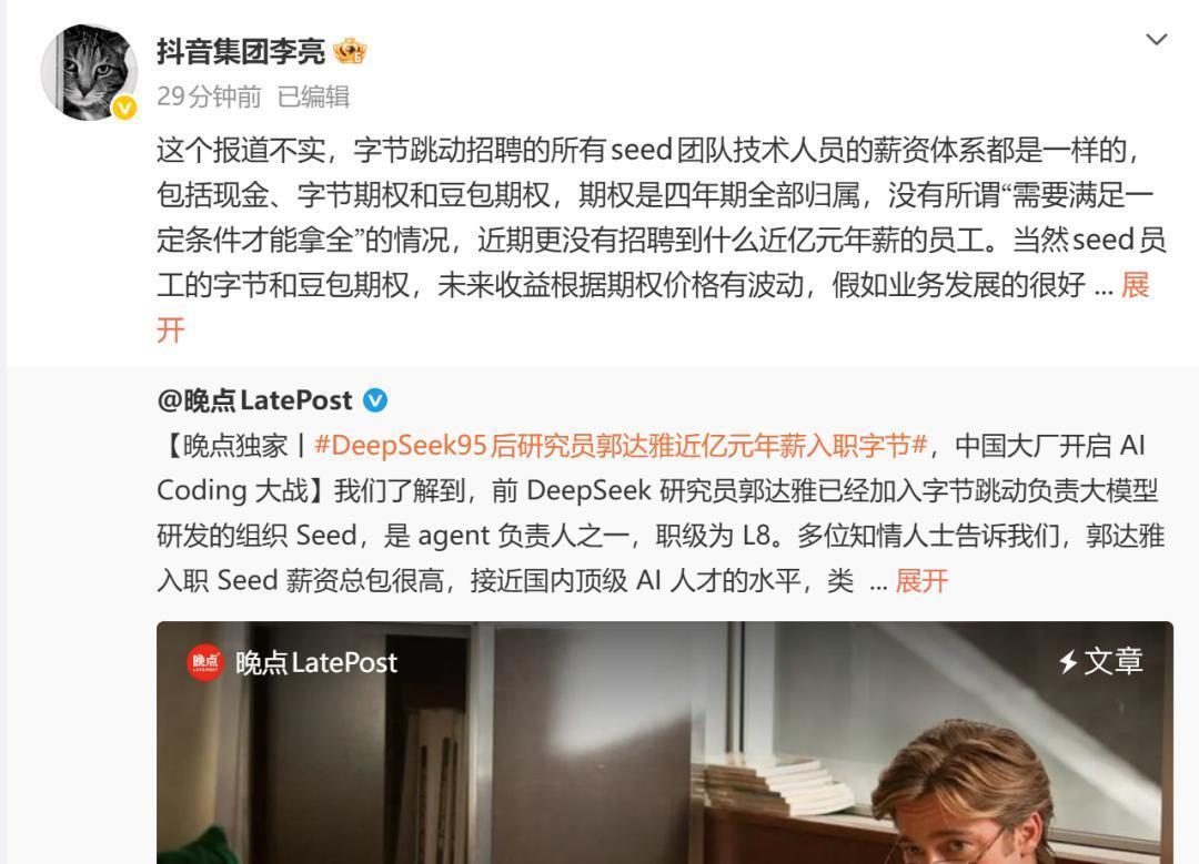 日前,有媒体报道“DeepSeek 95后研究员郭达雅近亿元年薪入职字节”,引发网络关注。对此,抖音集团副总裁李亮发文辟谣:这个报道不实配资搜,字节跳动招聘的所有seed团队技术人员的薪资体系都是一样的,包括现金、字节期权和豆包期权,期权是四年期全部归属,没有所谓“需要满足一定条件才能拿全”的情况,近期更没有招聘到什么近亿元年薪的员工。当然seed员工的字节和豆包期权,未来收益根据期权价格有波动,假如业务发展的很好,不排除有些seed技术人员四年后收益会达到数亿元。